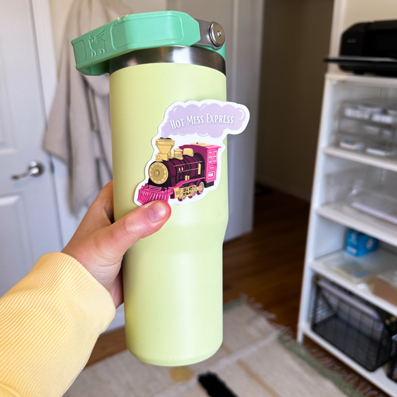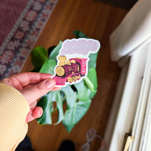All aboard the Hot Mess Express! This fun and sassy vinyl sticker features a whimsical pink train chugging along with the words "Hot Mess Express"—perfect for those days when life feels like a chaotic ride